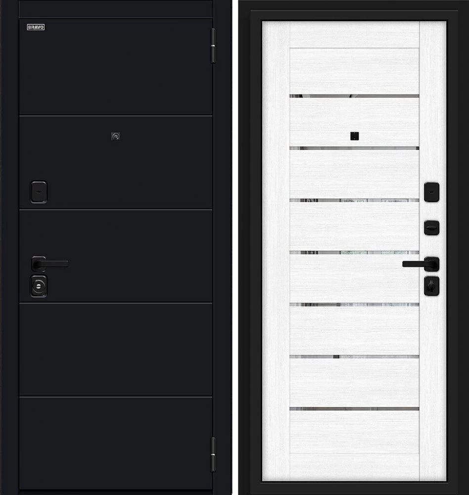 Надежная входная Дверь Браво Прайд Total Black/Snow Melinga премиум класса по цене 35 350 руб. Большая толщина стали защитит от проникновения в ваш дом, квартиру или коттедж. Используется очень качественная фурнитура: замки, цилиндры, ручки, защелки. Покрытие и отделка двери изготовлено под внимательным контролем производителя. Дверь имеет долгий срок службы и гарантию.